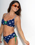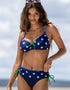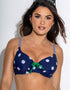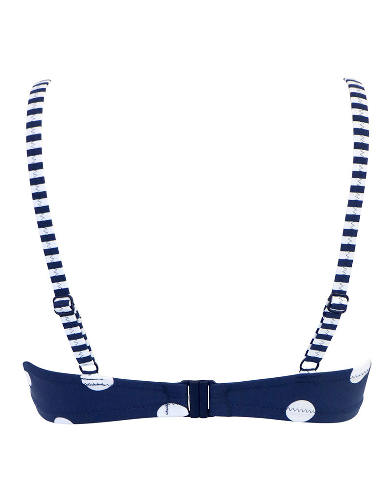 Whatever your destination, bring the holiday style with the Pour Moi Beach House bikini top in Navy/Green. The chic polka dot print in white on navy blue features contrasting striped shoulder straps and green bow detail to the center front. Non-padded cups are mesh lined to support and shape your bust, in a balconette cut that provides medium coverage.