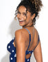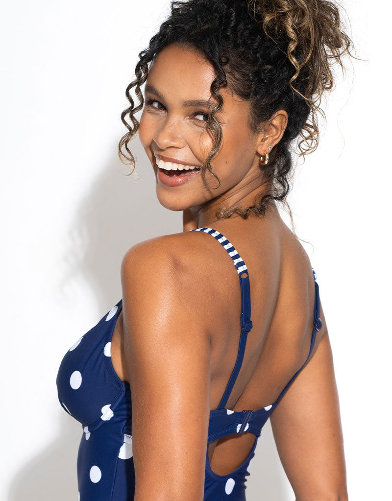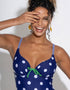 Pour Moi's Beach House swimsuit is super cute in navy blue with white spot print and green bow details. Underwired, mesh lined cups will keep you supported as you take a dip in the sea or relax by the pool, with a gently plunging neckline to give great shape. Cut with a fuller bottom to give a modest, comfortable fit that's suitable for any destination.