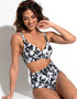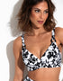 Style it out poolside with the Pour Moi Cali bikini top in in Black/White floral print. This pretty swimwear top is made using recycled polyamide content, in a soft fabric that gives all day comfort. Hidden underwires ensure D+ support and great shape so you can look and feel fantastic no matter your destination!