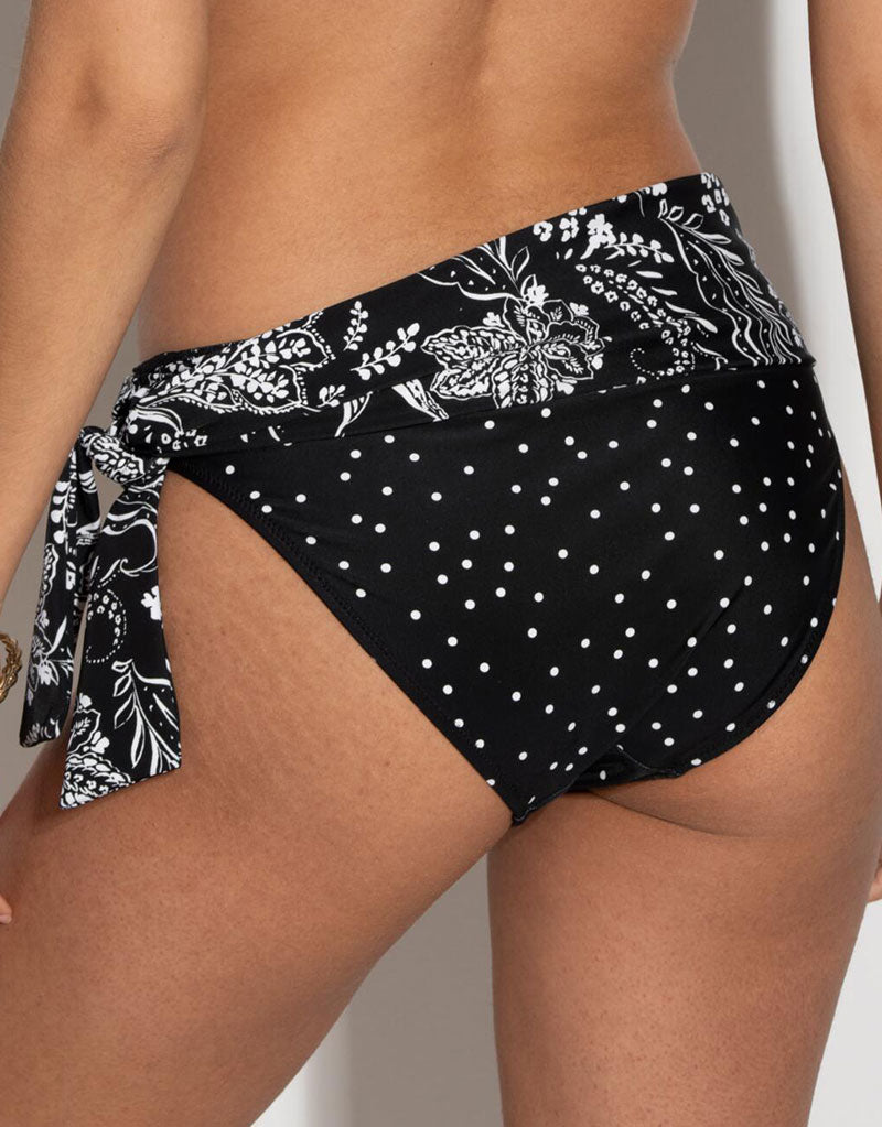 Your holiday style just got cuter with the Pour Moi Getaway fold over bikini brief, containing recycled polyamide for Earth-conscious design. The black base is a classic with cute white polka dots and floral print, cut in a simple brief shape to give moderate coverage. Finished with a fold over waistband to adjust the height, and a tie to secure at the side.