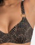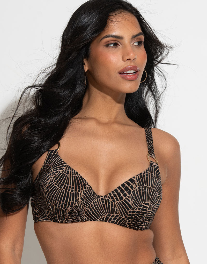 The Samoa plunge bikini top from Pour Moi Samoa is gorgeous in black with abstract seashell inspired gold pattern. A concealed underwire keeps it looking sleek and elegant offering hidden support, with non-padded cups and a mesh lining for shape and uplift. Finished with flattering gather detail to the outer cup to highlight your curves.