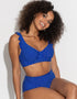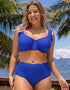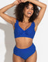 The Pour Moi Sicily longline bikini top is back in a cute blue with white spot print. Containing recycled polyamide, the soft swim fabrics feel gentle on the skin and offer all day comfort whether you're taking a dip or lounging poolside. The underwired cups offer D+ shape and uplift, while the subtle longline band adds extra support and a glamorous style. Gorgeous frill detail to the straps and subtle gathers across the bust give this a romantic vibe, perfect for any getaway!