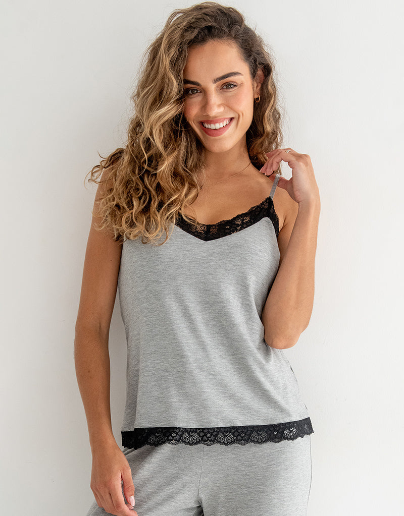 Made from soft viscose jersey, the Pour Moi Sofa Loves Lace secret support cami will elevate those cosy nights in. A soft grey marl is trimmed with black lace, with an hidden mesh panel in the bust to give gentle support, with fully adjustable shoulder straps too.