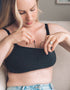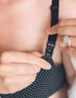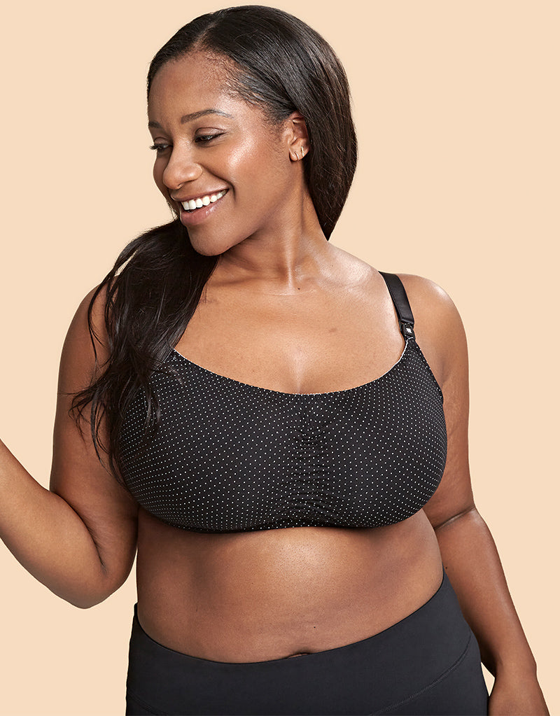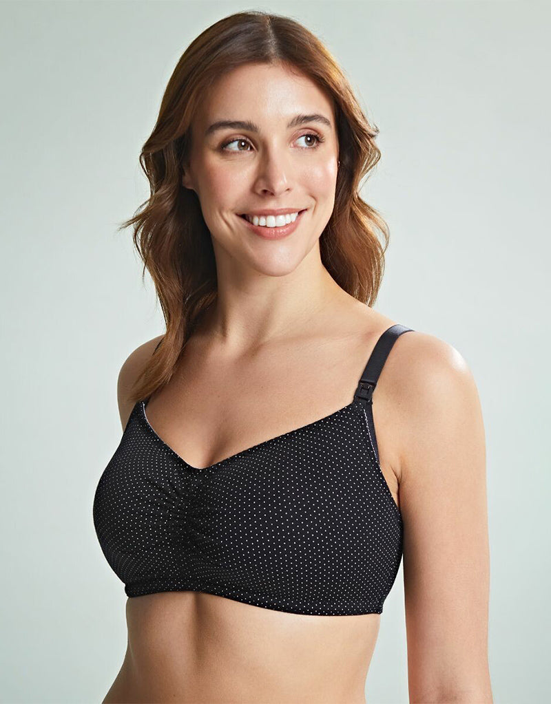 Royce's Blossom nursing bra is a fantastic option for breastfeeding mums. In black with dainty white polka dot, this bra is triple cup sized through to a H cup for a flexible fit. A unique drawstring at the centre front means you can wear it with a high or low neckline, and the straps are adjustable at the front for your ease.