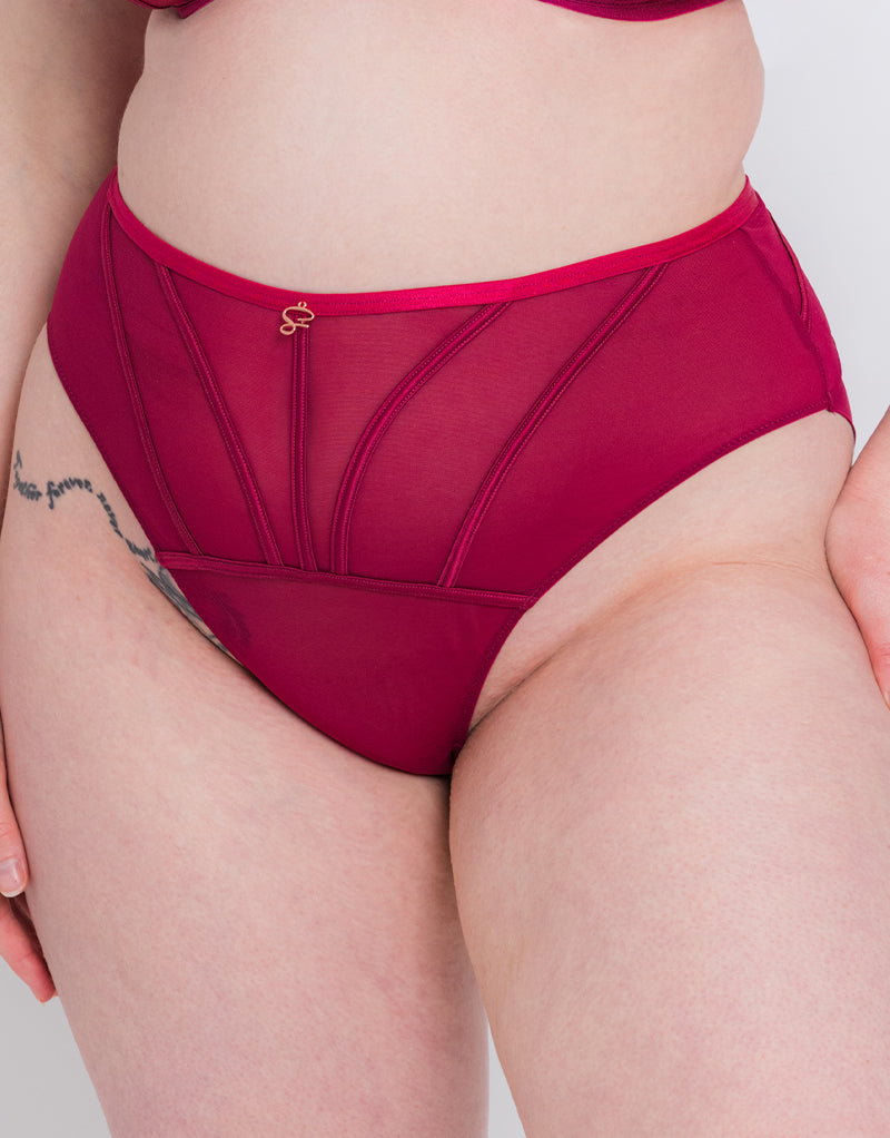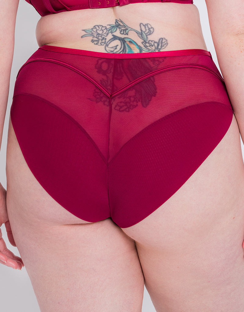 Make it a match with the Scantilly Senses high waist brief in a rich cherry hue. The high rise and high leg are stylish and flattering, with curved satin seams that follow the contours of your body to give a sexy, striking style. Finished with a folded mesh leg edge to the back for a smoother fit under clothes.