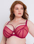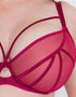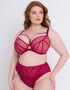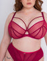 Scantilly's Senses plunge bra is stunning in a deep cherry red, made from a sheer mesh with curved satin seams that draw the eye and create a sexy, sultry style. A low plunging neckline meets overbust strap detail that looks divine peeking over a low cut outfit, while the 3-part cups give projection and uplift without adding bulk to your bust. This striking design is available in sizes up to a 40J, offering an extended size range to the Scantilly brand.