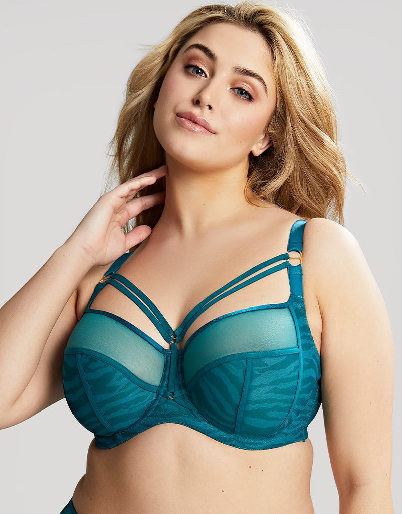 The Dionne full cup bra from Sculptresse by Panache is stunning in a teal animal print. Supportive, uplifting cups are made in a 4-part shape with side panels and laminated bottom cups to give a projected shape with a firm, comfortable fit. Trimmed with double strap detail to the overbust for a sexy vibe that looks perfect peeking out under a lower neckline.