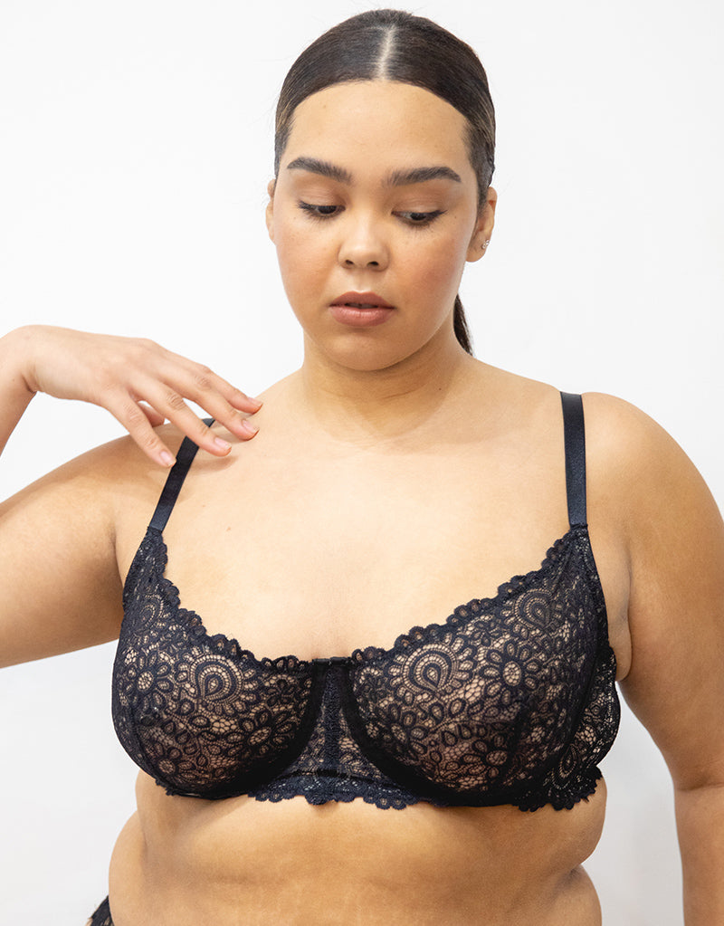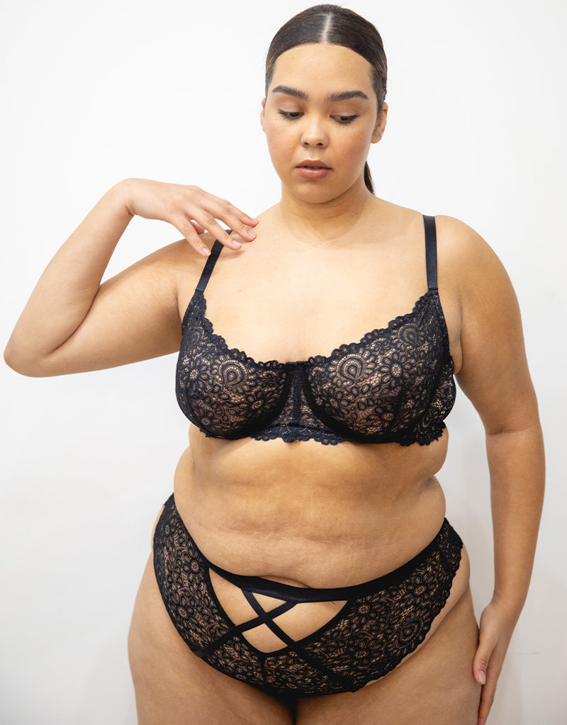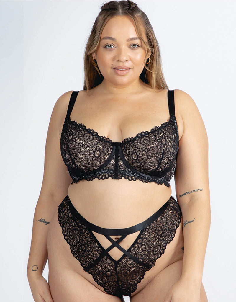 The Victoria Heroic lace balcony bra from We Are We Wear is a stunning option with intricate florals. Designed with non-padded cups, shaped by a single dart to give a natural shape and subtle uplift and trimmed with contrasting satin binding. Made to make you feel fantastic!
